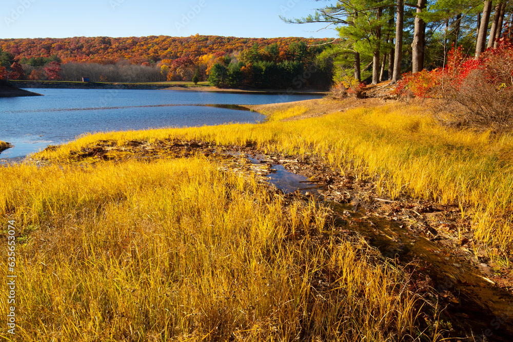 Placid fall scene at Buckingham Reservoir in Glastonbury, Connecticut.
