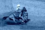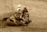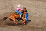 Cowgirl riding in a barrel racing completion at a rodeo. She is wearing red shirt and blue jeans and a white hat. The horse is brown. The barrel is in front of the horse.