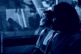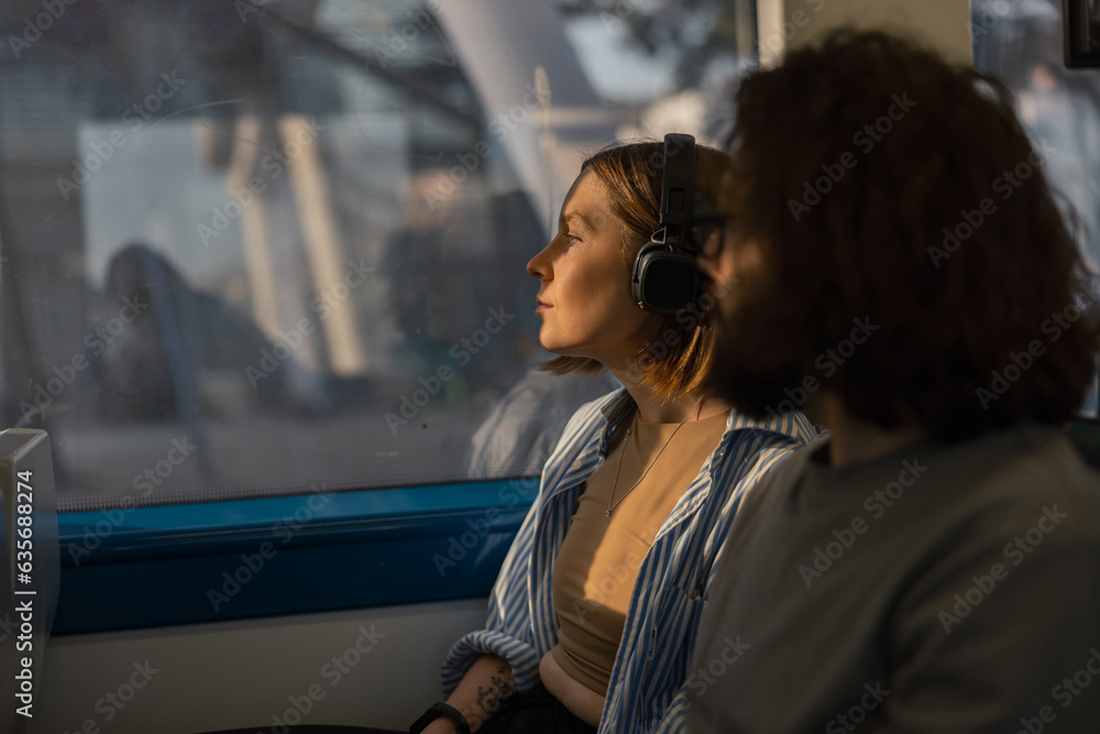 Young romantic couple is travel together while riding in public bus . High quality photo