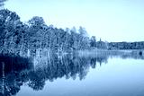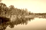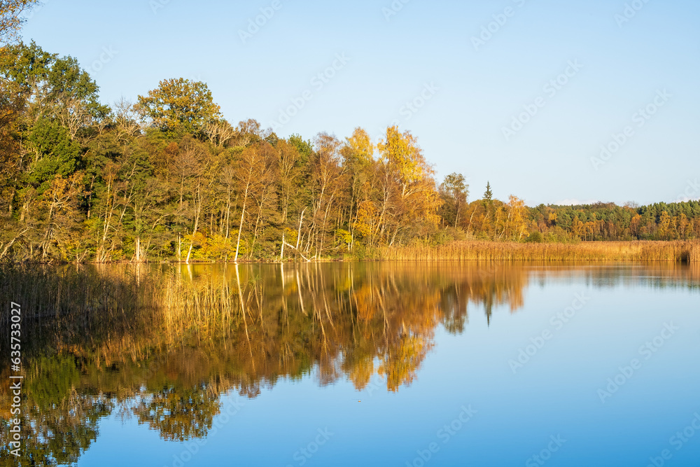 Calm water by a lake with reflections and autumn colors