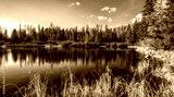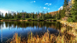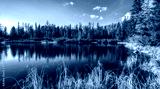 Coniferous trees reflecting in calm water surface of lake. Blues sky at background