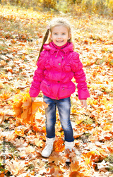 Autumn portrait of cute smiling little girl with maple leaves