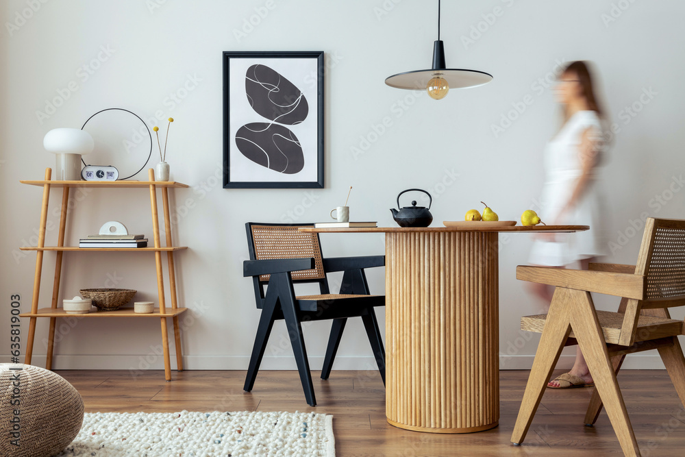 Interior design of aesthetic and elegant room with woman in dress, mock up poster frame, round table, vegetables, rattan chair and personal accessories. Stylish home decor. Template.
