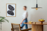Interior design of domestic dining room space with two mock up poster frames, round table, chair, pedant lamp, decoration and woman in jeans. Minimalist home decor. Template.
