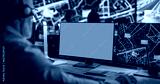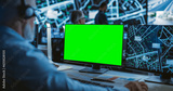 Middle Aged Surveillance Specialist Working on a Computer with Green Screen Mock Up Display. Manager Effectively Multitasking with Supporting Clients on a Phone Call and Computer Work