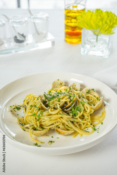 clam shell spaghetti on white table
