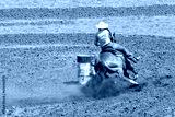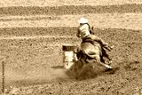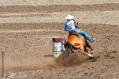 Cowgirl riding in a barrel racing completion at a rodeo. She is wearing blue shirt and blue jeans and a white hat. The horse is brown. The barrel is behind the horse.