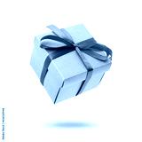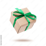 Object elegant beige gift box with green ribbon bow falling, flying in air with shadow Isolated