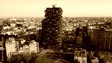 Europe, Italy,Milan 08-18-2023 - drone aerial view of Vertical Forest ( bosco verticale ) luxury skyscraper ecological and sustainable with trees and greenery on the facades in Gae Aulenti new skyline