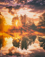Dawn on a lake or river with a sky reflected in the water, birch trees on the shore and the sunbeams breaking through them and fog in autumn. Aesthetics of vintage film.