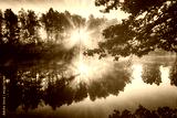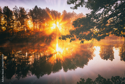 Dawn on a lake or river with a sky reflected in the water, birch trees on the shore and the sunbeams breaking through them and fog in autumn. Aesthetics of vintage film.