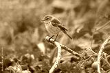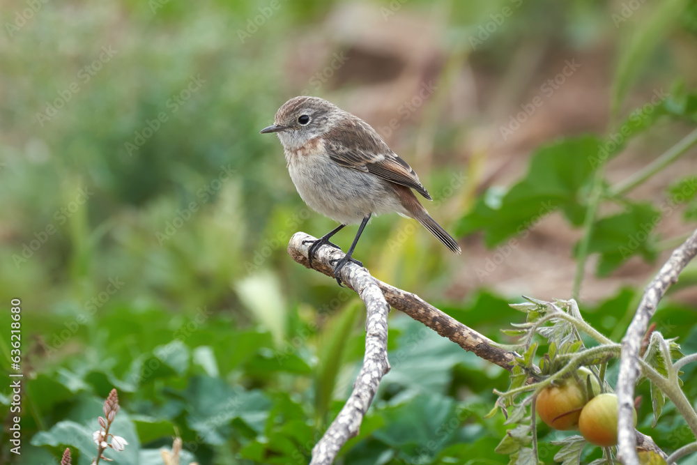 Kanarenschmätzer (Saxicola dacotiae) Weibchen auf einem Ast in einem Garten mit Tomatenpflanzen - Cardón, Fuerteventura