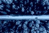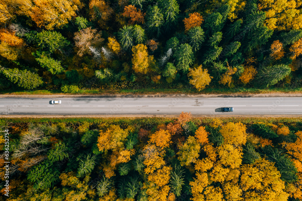 Aerial top view of road with car through fall forest with colorful leaves.