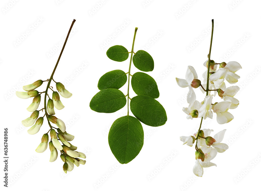Set of twig of acacia flowers, buds and young green leaves isolated on white or transparent background