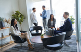 Busy diverse professional team business people workers talking in modern corporate office lobby. International coworkers group having teamwork conversation together at work meeting. Authentic shot