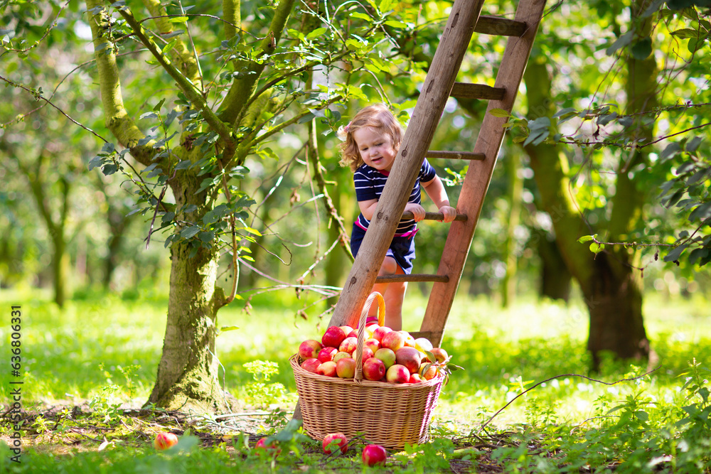 Child picking apples on farm. Fruit orchard fun.
