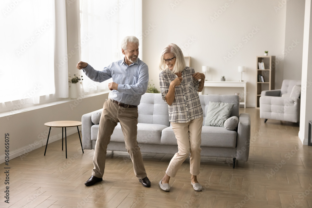Cheerful active retired elder dancing to disco music in spacious living room, having fun, enjoying sportive hobby, home party, celebrating anniversary, family special date