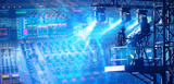 Concert background. Lighting equipment above auditorium. Tower with spotlights. Lighting fixtures for concert. DJ mixing console. Sound equipment. Equipment for organizing concert. Art focus