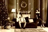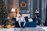 Portrait of a young couple in their living room at christmas eve. christmas decoration on a sofa. Lovely couple in love embracing, sitting on sofa near christmas tree