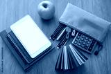 Back to school. School supplies on wooden desk, books and digital tablet with wide screen, calculator pencils and green apple, student accessories - back to school concept