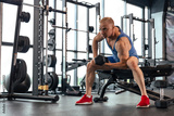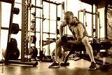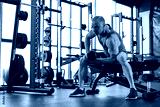 Muscular man working out in gym doing exercises with dumbbell at biceps.