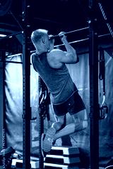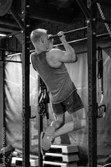 Fit and muscular man shakes his back on the simulator. Back view.