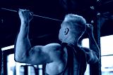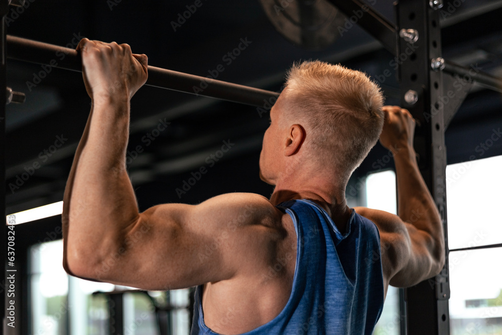 Fit and muscular man shakes his back on the simulator. Back view.