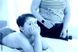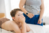 Portrait of pretty five year old boy looking at camera lying on couch waiting pediatric masseur. Side view of adorable child awaiting therapeutic treatment in medical clinic. Concept of childcare.