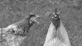 a crazy red hen with an open beak screams at a red rooster on a green background. family quarrel, surprise