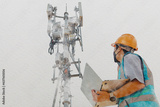 Helmeted asian male engineer works field with telecommunication tower that controls mobile electrical installation using laptop to monitor and maintain 5G.