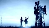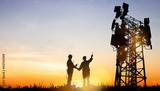 Silhouette architect electrician team in sunset Two engineers are planning to power towering outdoor telecommunication antenna tower that will improve the performance of generation 5G technology.
