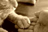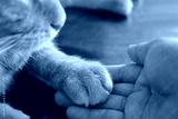 Cat paw on human hand. Ginger cat paw and woman hand. The concept of love and friendship between pet and human.