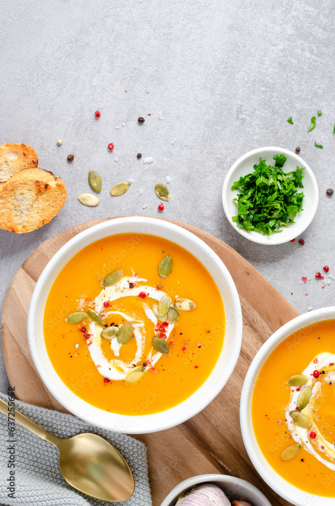 Pumpkin Soup, Tasty Homemade Pumpkin, Sweet Potato, Carrot Soup in a Bowl on Bright Background