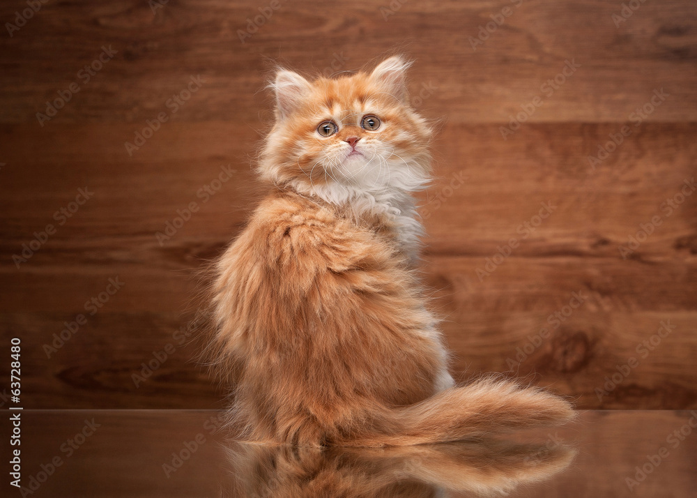 red highland kitten on mirror and wooden texture