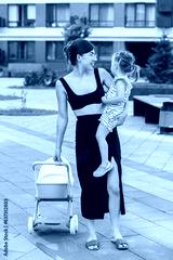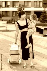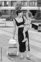 Mother walks with girl toddler outdoor. Baby doll stroller. Developmental milestones. Early years