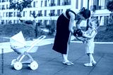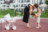 Mother walks with girl toddler outdoor. Baby doll stroller. Developmental milestones. Early years