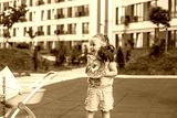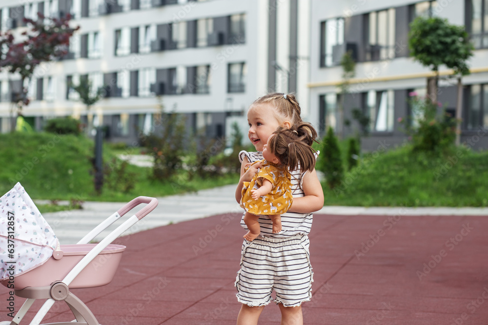 Toddler girl playing with toy stroller with doll. Two years old. Developmental milestones.