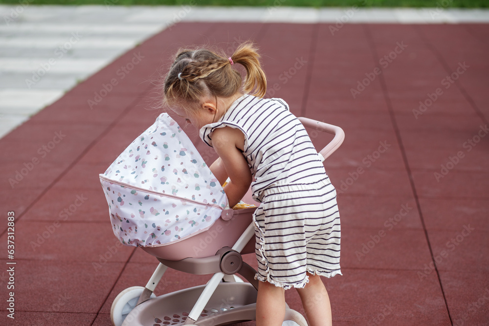 Toddler girl playing with toy stroller with doll. Two years old. Developmental milestones.