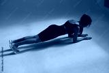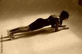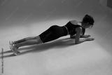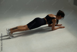 a tanned sports girl in a black suit is training in a yoga class in a fitness studio. white room. morning workout. warm-up