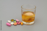 Glass of alcohol drink and human brain and drugs on gray background.