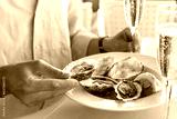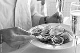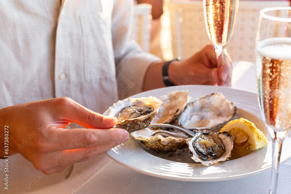 A man Eating Raw Oysters with lemon and ice served and holding a glass of champagne, wine. Seafood dinner, Italy.