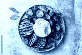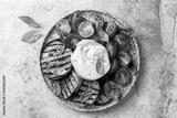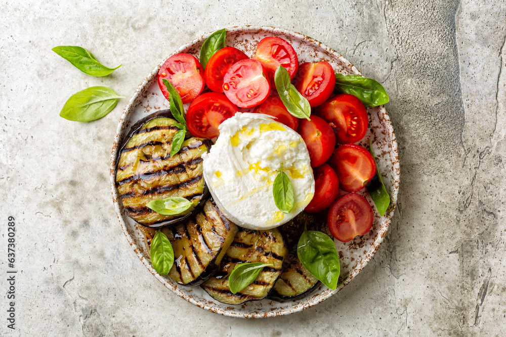 Plate with Burrata or mozzarella cheese and vegetables, grilled eggplant, tomatoes, basils, grissini and olive oil. Italian food, snack.