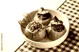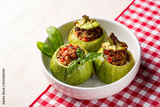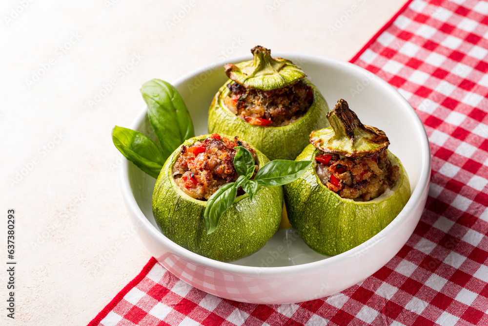 Italian style Stuffed round Zucchini with sausage, hard cheese parmesan, bell pepper, egg and bread crumbs filling in a white bowl, red napkin.