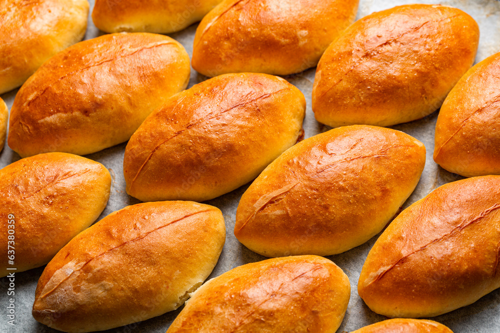 Cooking mini pies Pirozhki or piroshki on a cooking tray. Close-up. Homemade baked yeast boat shaped buns with cabbage fillings. Eastern Europe food.