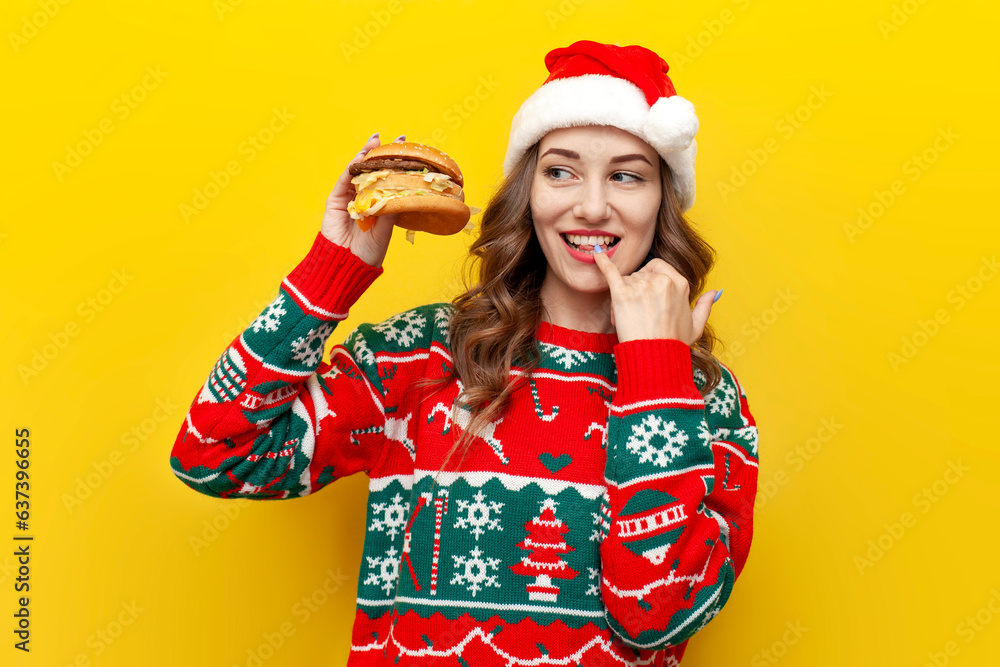 young girl in christmas sweater and santa claus hat holds big cheeseburger and licks the sauce
