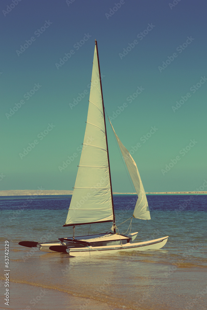 sailing catamaran on beach - vintage retro style