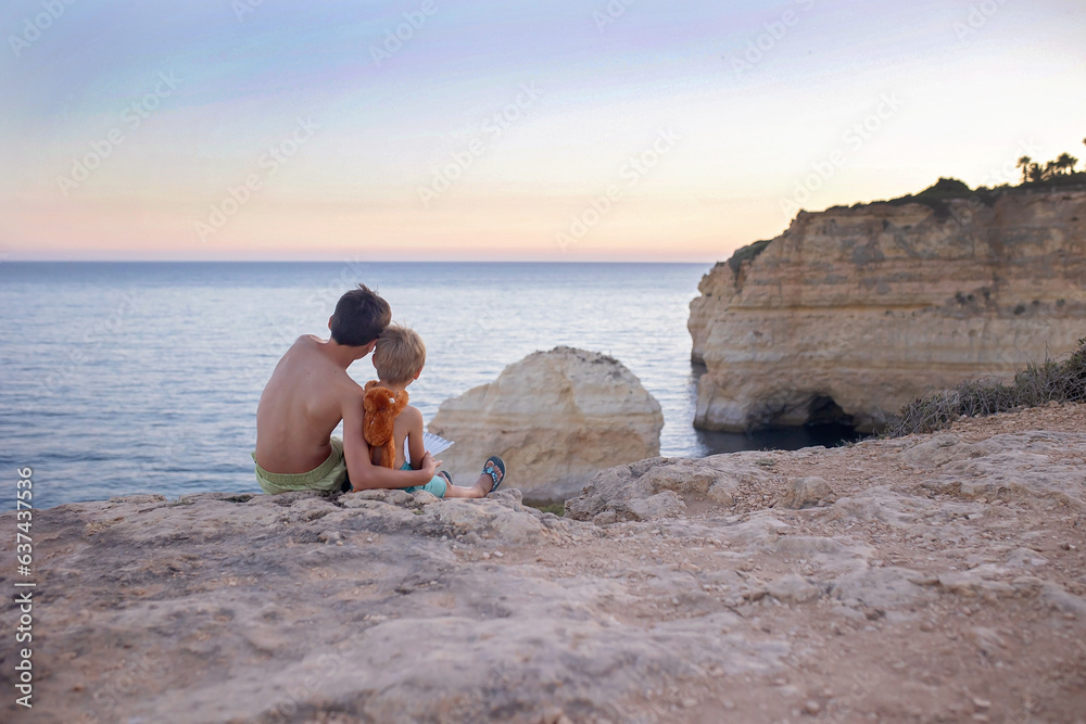 Happy children, playing on the beach on sunset, kids running in the water in the ocean