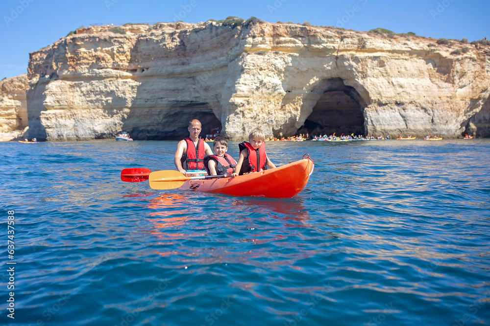 Children, enjoying Benagil, Portugal. Benagil Cave inside Algar de Benagil, famous sea cave in Algarve coast, Lagoa.