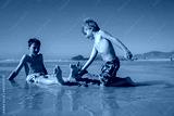 Child, tickling sibling on the beach on the feet with feather, kid cover in sand, smiling, laughing
