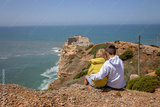 Family with children, visiting the beach with the biggest waves in the world in Nazare, Portugal